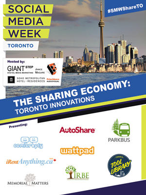 titled 'The Sharing Economy: Toronto Innovations' along with representatives from Giant Step/ComicReply, WattPad, Autoshare, Torontto Tool Library, ParkBus, iRentAnthing and Janice Maguire at the Soho Met Hotel in Toronto